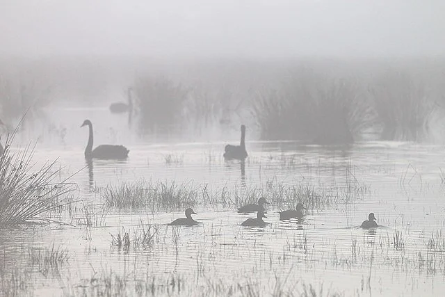 At Greylake we heard Cetti’s Warbler and responding Water Rails; from the hide we saw the usual ducks – mostly teal – and a few Snipe flying in; but sadly, not much else. The same was true at Stathe, so we called it a morning and headed to the King Alfred Inn at Burrowbridge, where we enjoyed our usual warm welcome and excellent food and drink. From here we headed on a route around the Levels (still not seeing much!) and then walked into Meare Heath. Again, we were limited by the fog, but did enjoy good views of a male Bullfinch who was calling to an unseen mate somewhere nearby; and a lovely little Goldcrest hunting for tiny insects in a bush; as well as ducks on the pool, a pair of Stonechats and a Great White Egret. We then strolled back into Ham Wall for our second Starlings encounter, the first flock arriving at 15.53. At first this was rather frustrating, but we then heard the birds calling from the path down towards the Tor View Hide; here we had a splendid and intimate view of thousands of Starlings landing on a small but close reedbed; and then periodically shooting up into the air, before eventually deciding that perhaps the reedbed was indeed too small, so they headed back towards a larger one! Sometimes, when you have had a frustrating day with little reward you deserve a surprise – and this was certainly that!