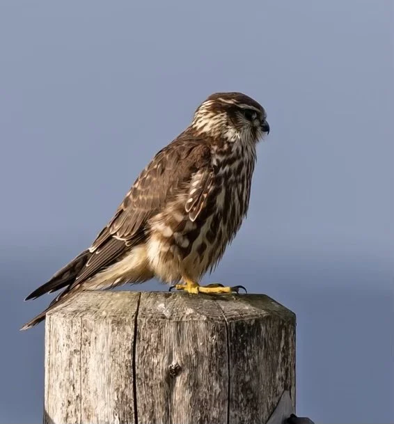 On the River Parrett, at first most of the birds were on the far side, but we did see a Raven close by on the grassy ridge, 33 Canada Geese along the grass on the near side; and as the tide began to rise, lots of waders came across: Curlew, Avocet, Grey Plover and flocks of Dunlin, while Skylarks burst into song, along with a few Meadow Pipits, a Linnet flock, and then our usual young male Merlin, first on a rock and then on a post, where it preened, showing beautifully through scope. Meanwhile, four young Ravens played high above; two flocks of seven and six Black-tailed Godwits headed inland; and we saw a distant Oystercatcher on the island and a nearer pair of Stonechats. Finally, as we walked back, the Merlin and one Raven flew off to the south. A splendid end to a frustrating tour, because of the fog – but still with some real quality birds and sights!